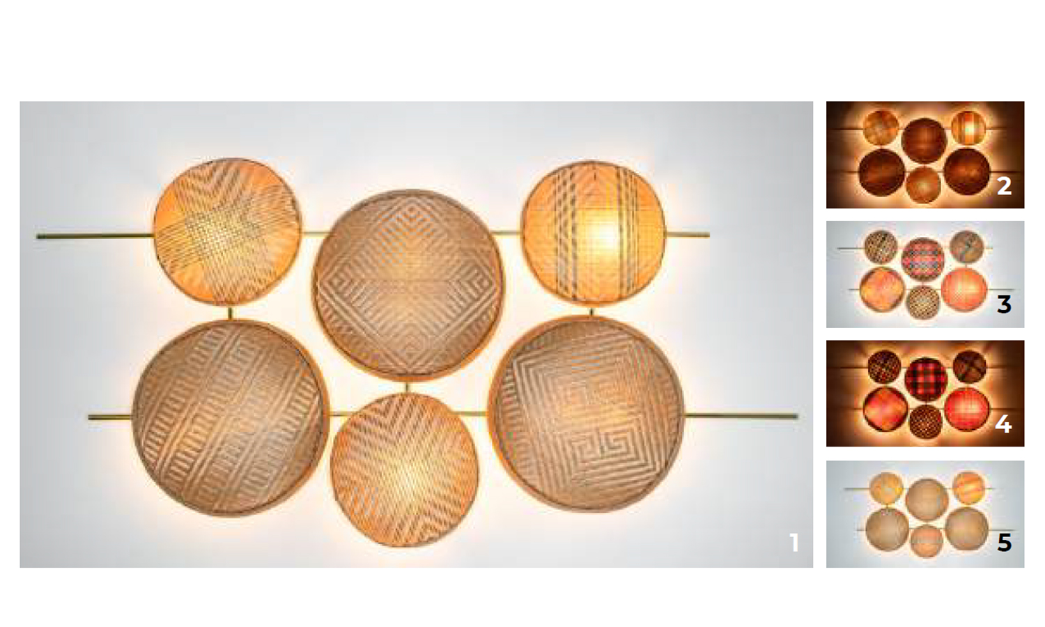 A Arandela Munclair Baniwa Trama 2401-6 mantém a composição de grande formato com seis balaios em dois diâmetros (3x Ø30 x A6 cm e 3x Ø40 x A7 cm), formando um conjunto 81 x 162 x 10 cm de forte presença. Na versão com ligação direta, o acabamento fica embutido e minimalista, elevando a integração arquitetônica da peça.
