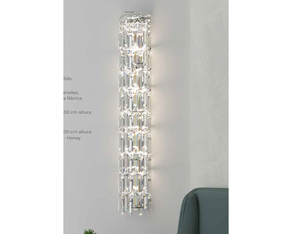 A ARA-024 Ártemis 4 é uma arandela vertical imponente, medindo 20 × 100 cm e equipada com 8 lâmpadas G9, ideal para paredes grandes, escadas, salas amplas e projetos comerciais sofisticados.