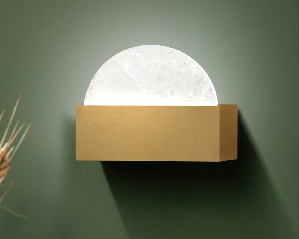 A Arandela Sun apresenta design compacto, moderno e elegante, valorizado pelo brilho suave da rocha selenita, que adiciona textura natural e requinte à iluminação. Com dimensões de 5 × 10 × 5 cm, é perfeita para composições discretas que exigem iluminação suave e decorativa.