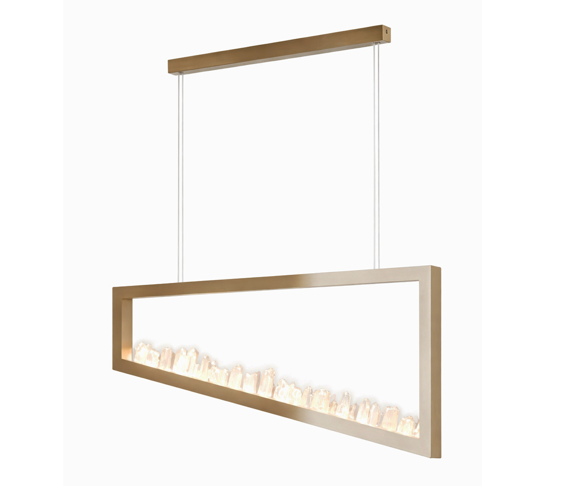 O Lustre Arch Uno apresenta design arquitetônico contemporâneo, combinando linhas limpas com a estética natural da rocha selenita. Suas dimensões de 85 × 5 × 45 cm o tornam uma peça ideal para composições lineares ou ambientes que valorizam iluminação sofisticada e escultural.