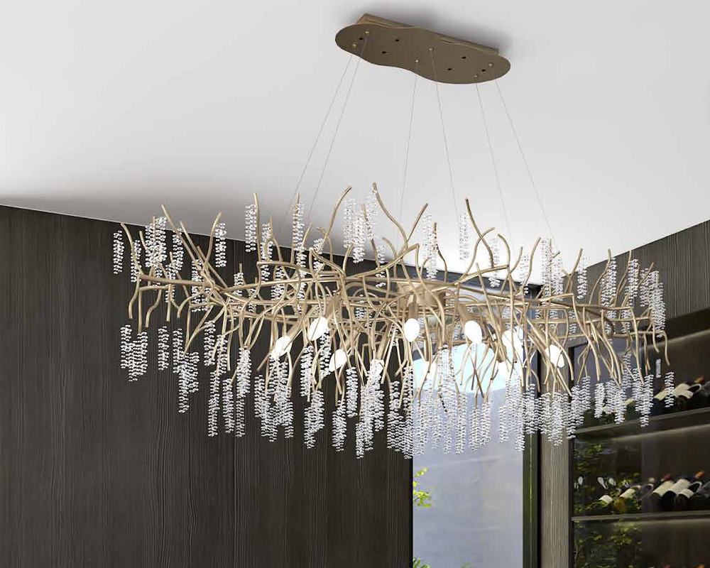 O Lustre Branch Lavanda 150×80cm foi pensado para mesas retangulares, ilhas e espaços de grande porte. Sua estrutura em formato de galhos alongados com castanhas de cristal cria um desenho fluido e romântico sobre o ambiente.
