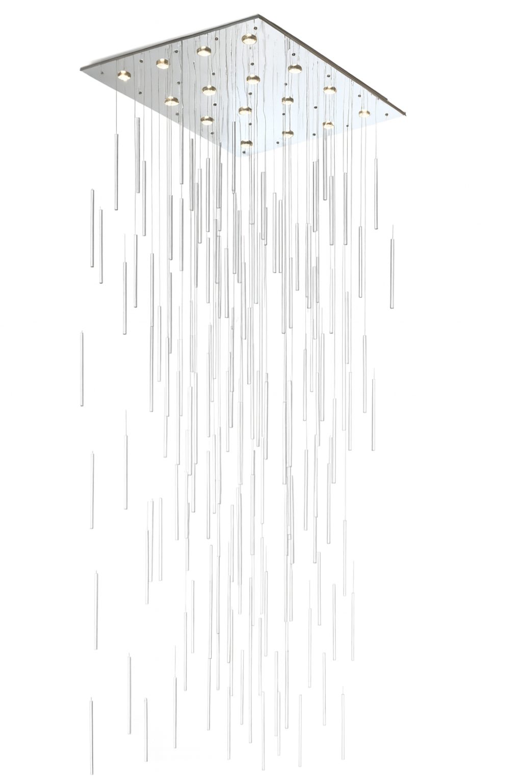 A iluminação com 11 lâmpadas GU10 reforça o efeito de “garoa luminosa”, marcando escadas, halls e salas de grande porte.