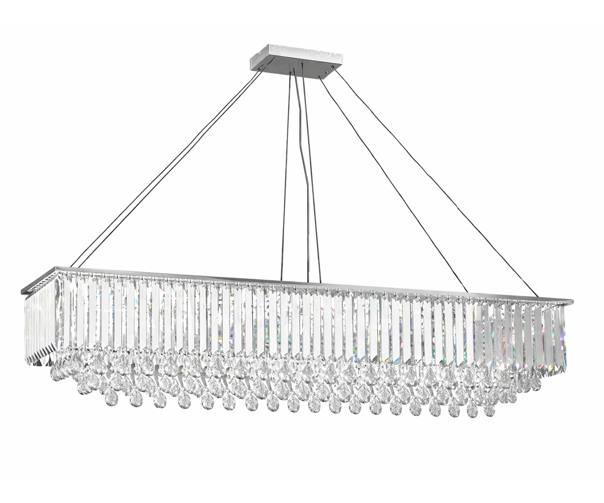 O Lustre Monarca é uma peça imponente e decorativa, medindo 110 × 30 cm e trazendo composição luxuosa com placas e amêndoas em cristal.