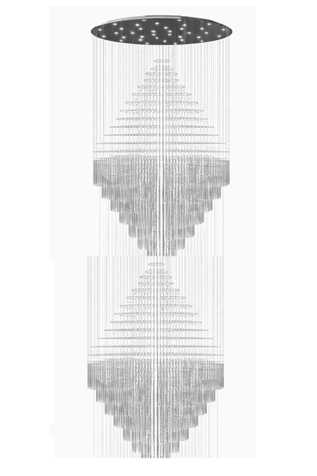 O aro de Ø80 cm com 11 lâmpadas GU10 é combinado com tubos longos de 3,0 a 3,5 metros, criando um efeito luxuoso para pé-direito duplo.