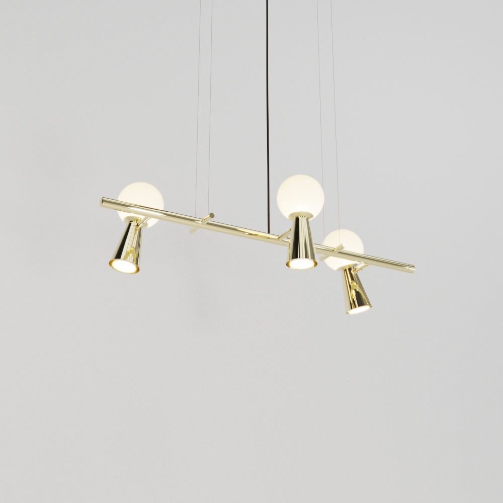 O Lustre PIVÔ Linear da Golden Art Iluminação é uma peça de design contemporâneo que combina bolas de vidro decorativas com spots direcionais, criando um equilíbrio perfeito entre iluminação funcional e estética sofisticada. Sua estrutura em latão confere acabamento premium e presença visual marcante.