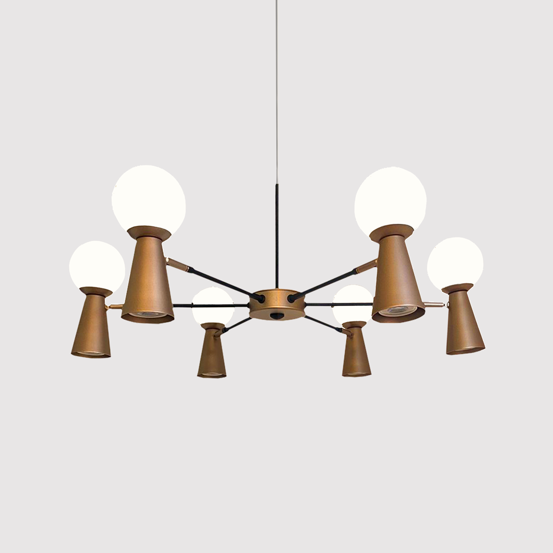 O Lustre PIVÔ Redondo da Golden Art Iluminação é uma peça de forte presença estética, que une bolas de vidro decorativas a spots direcionais, criando um equilíbrio perfeito entre iluminação ambiente e luz técnica. Sua estrutura em latão garante acabamento premium e sofisticação ao projeto.