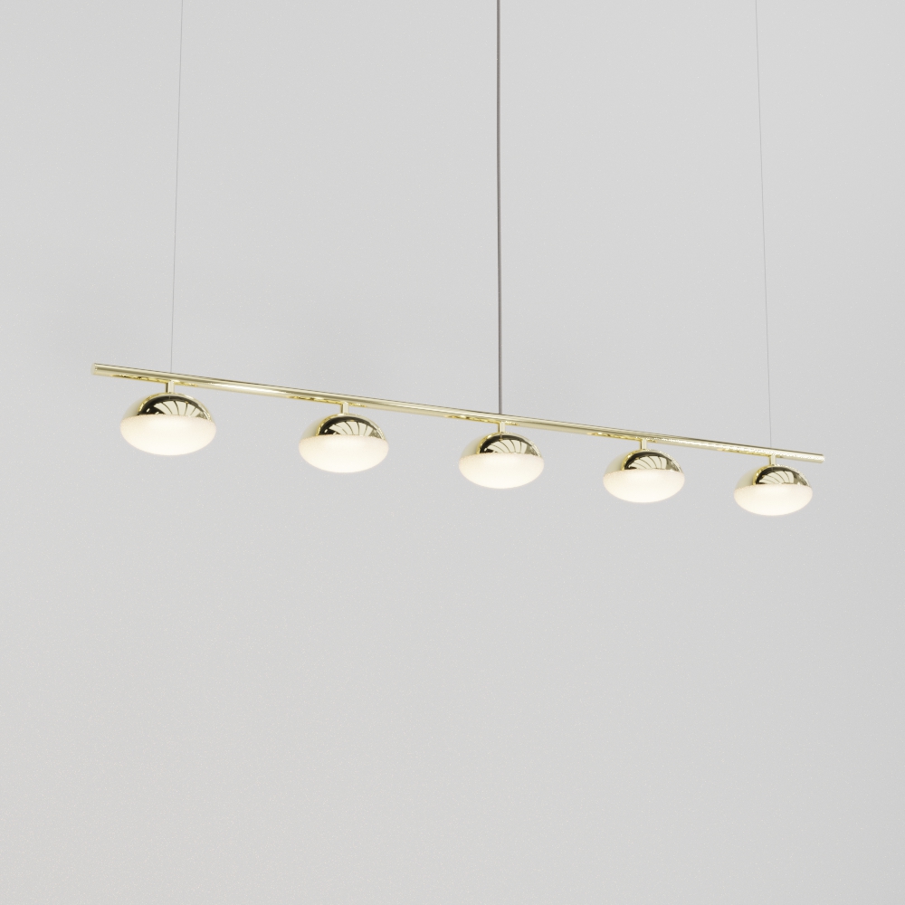 Produzido integralmente em latão, o pendente apresenta excelente durabilidade, resistência e visual refinado. Sua composição com cinco pontos de luz cria um efeito visual equilibrado e elegante, valorizando ambientes amplos.