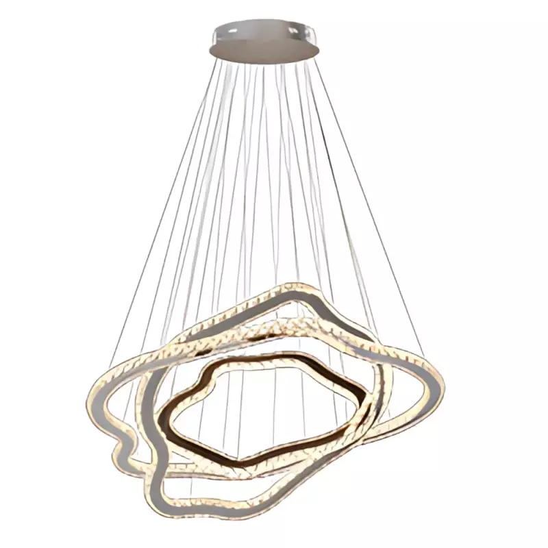 O Pendente Aliança Orgânica Triplo apresenta três aros em diferentes diâmetros (100 cm, 80 cm e 60 cm) criando um conjunto escultural de grande impacto visual. É uma peça ideal para áreas amplas e projetos contemporâneos de alto padrão.