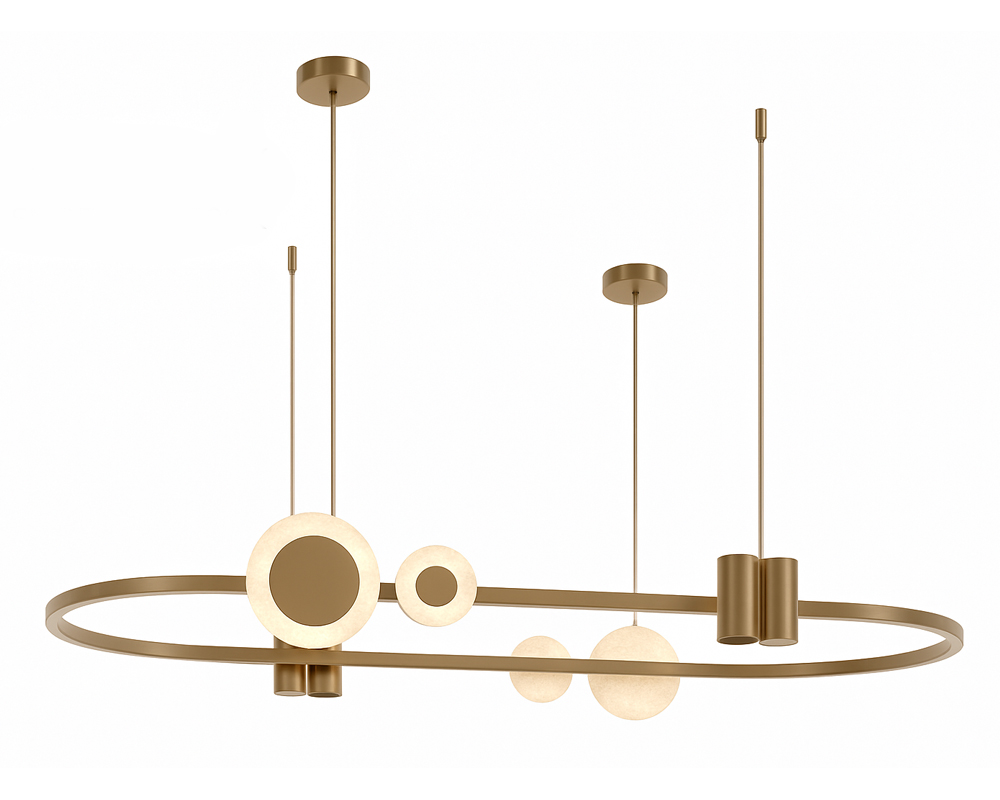 O Pendente DNA Iluminação L0115, da Linha Kálida Oval, apresenta design contemporâneo com dimensões generosas de 120×50 cm e 4 cúpulas em rocha selenita. A combinação de elementos naturais com iluminação moderna cria um efeito visual sofisticado e acolhedor.
