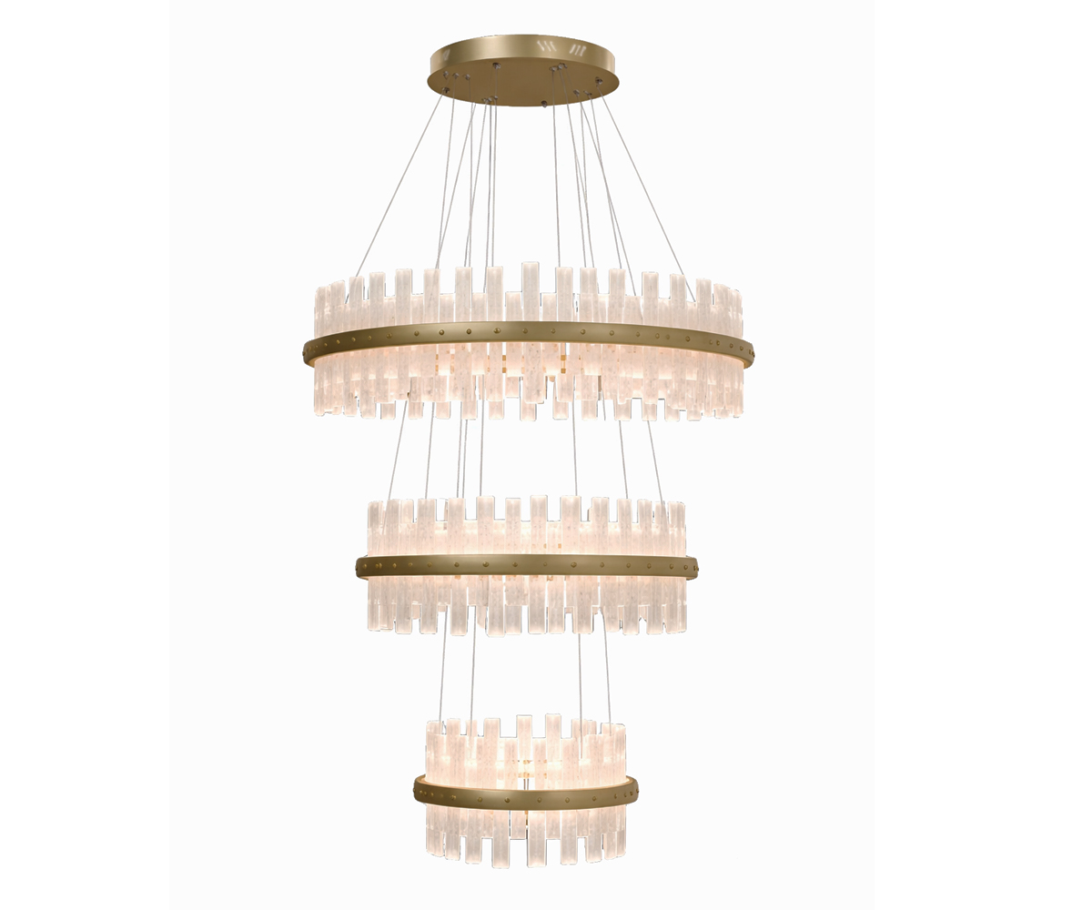 O Pendente Siena Felsen Triplo é a versão mais imponente da linha, combinando três aros Ø80 cm, Ø60 cm e Ø40 cm em composição vertical escultural que transforma o ambiente em um ponto de destaque arquitetônico.