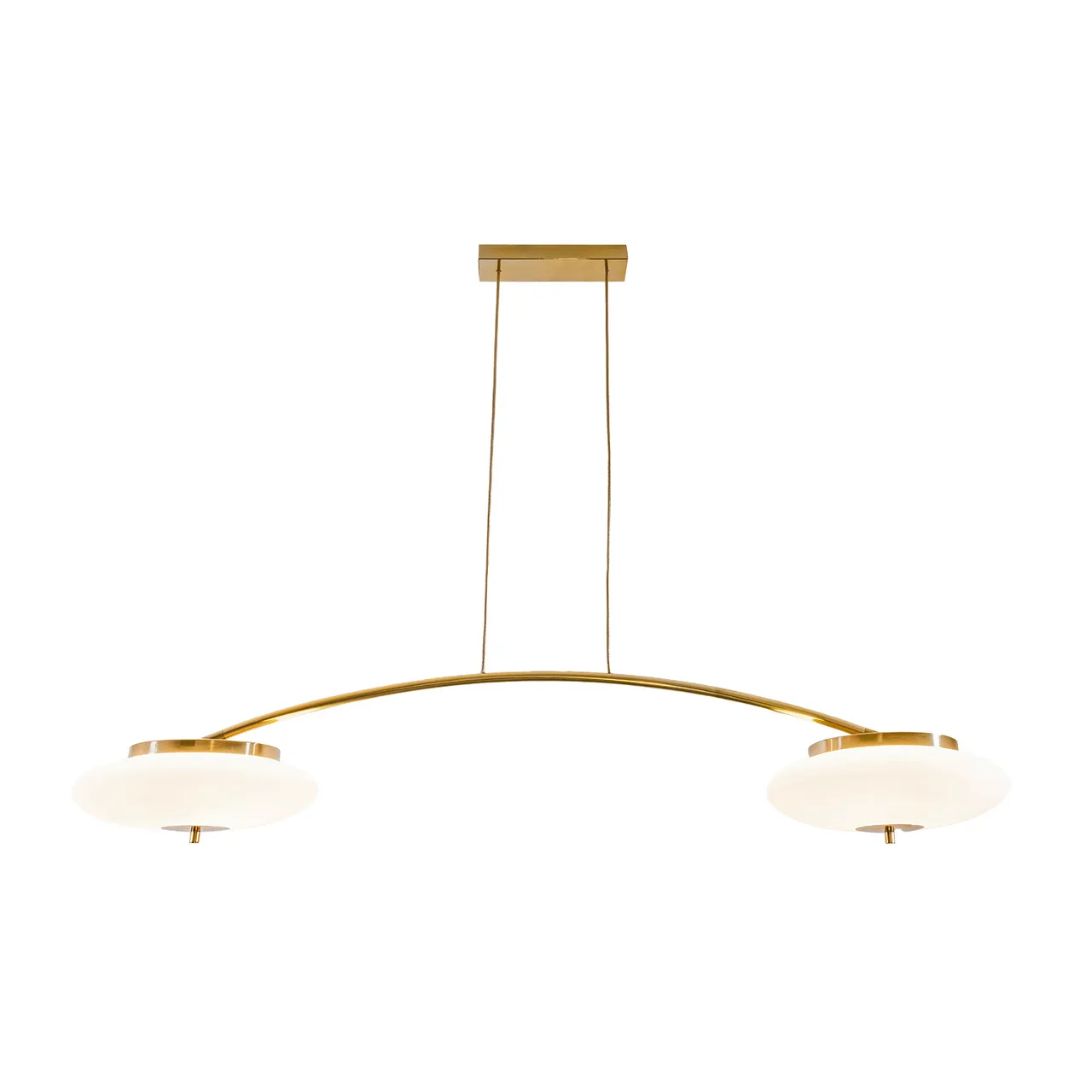 O Pendente Munclair Lis Arco Médio 4700-2, criado pelo Studio Munclair, combina proporções generosas e luz confortável para mesas e ilhas. O corpo mede L39 × C140 × A26,5 cm e utiliza dois vidros brancos foscos Ø39 × A11,5 cm que garantem difusão homogênea. A altura total regulável até 200 cm facilita o ajuste do caimento conforme o pé-direito do ambiente.