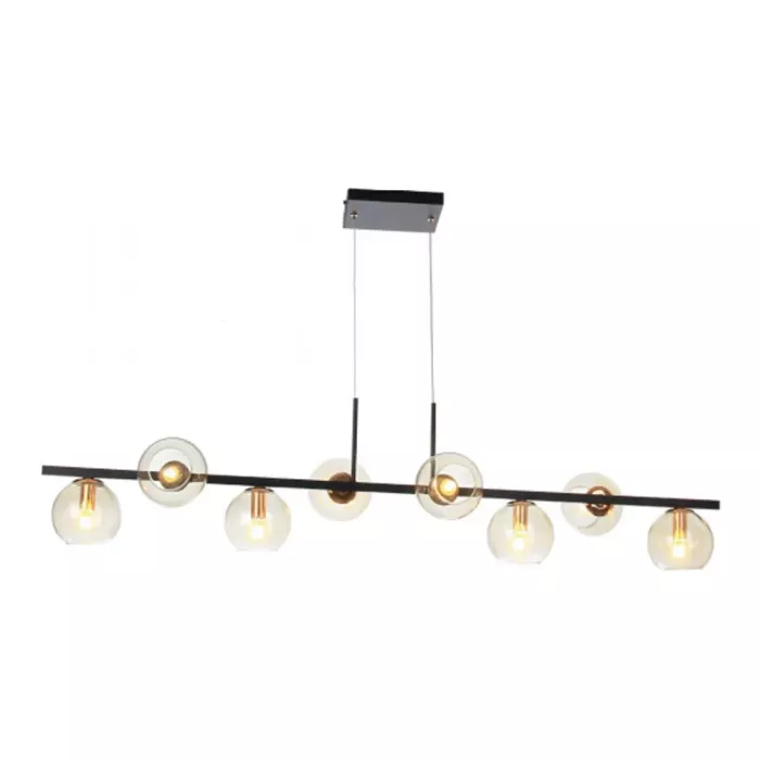 O PD-5438 é um pendente linear de grande impacto visual, equipado com 8 lâmpadas G9 e globos de Ø120 mm. Suas proporções C1200 × L255 × A180 mm tornam a peça ideal para salas, mesas, ilhas e ambientes amplos.