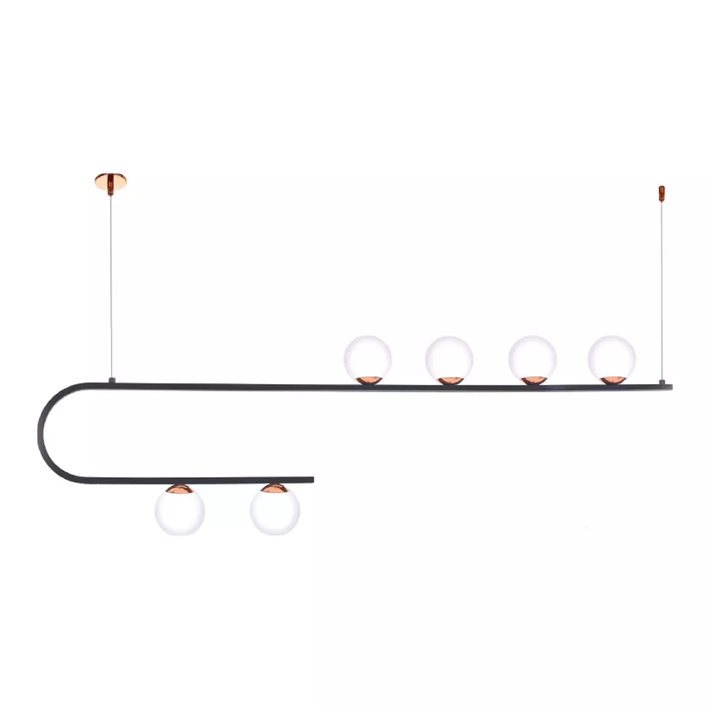 O PD-5513 é um pendente de grande presença visual, utilizando 6 lâmpadas G9 distribuídas em globos de Ø100 mm. Sua estrutura longa, com C1300 × L100 × A400 mm, cria iluminação difusa ideal para salas amplas, mesas grandes e áreas gourmet.