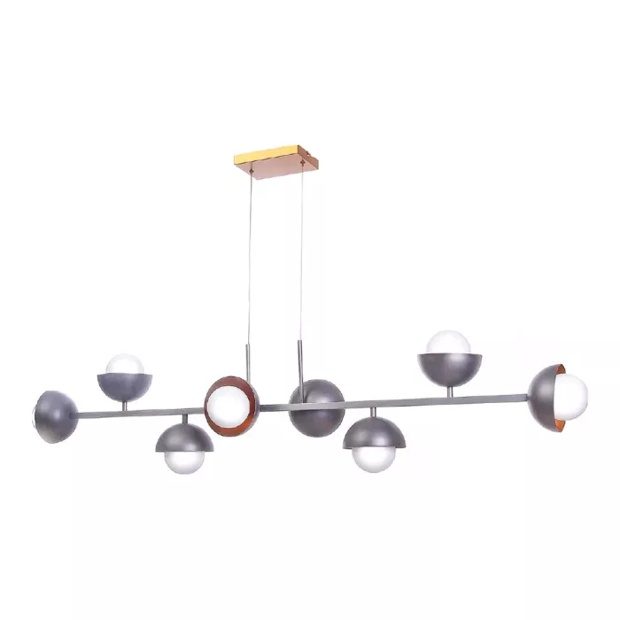 O Pendente Old Artisan PD-5521 utiliza 8 lâmpadas G9 distribuídas em globos de Ø100 mm, criando iluminação difusa e elegante. Sua estrutura longa de C1440 × L140 × A300 mm o torna ideal para ambientes amplos.