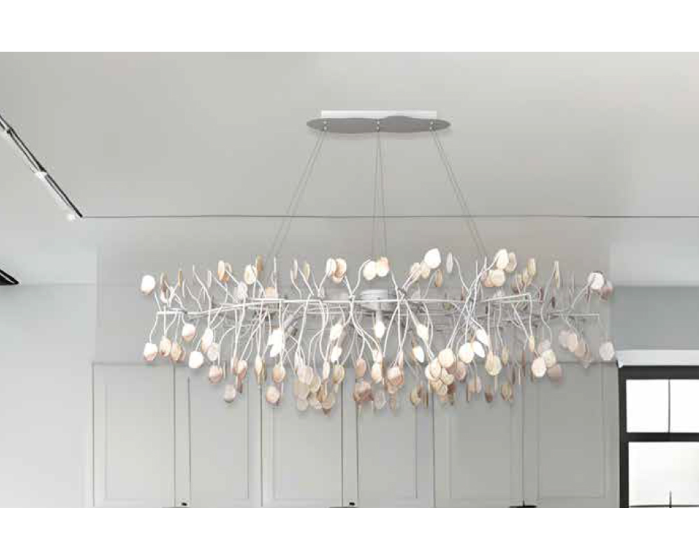 Com 10 lâmpadas E14, o plafon entrega iluminação ampla e uniforme, valorizando a textura das pedras naturais e o desenho orgânico da peça.